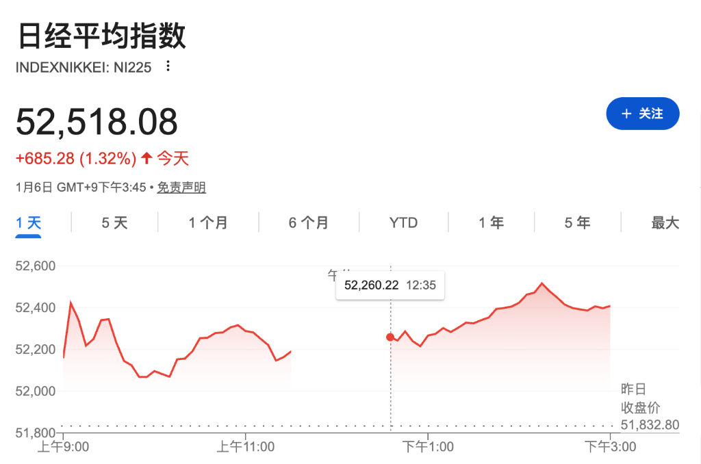 2026年亚洲股市以历史性强势开局,多个主要股指刷新纪录。MSCI亚太指数在年内前四个交易日累计上涨约4%,创下自1988年有记录以来的最 佳开年表现。 日本股市领涨,日本东证指数与日经225指数在年初两个交易日内分别上涨3.8%和4.3%,这是自1990年以来,新年头两个交易日涨幅最大的一 次。1月6日,日经225指数收于52518.08点,刷新收盘历史高点。韩国股市同步走强,综合股价指数(KOSPI)收涨1.32%至4525.48点,亦创下收 盘历史新高。 Banque Pictet & Cie SA管理合伙人Raymond Sagayam表示,亚洲等新兴市场正受益于具有吸引力的估值水平以及毗邻人工智能产业链的区位优 势。市场分析认为,日本股市的强劲表现得益于海外资金与国内个人投资者的积极买入,叠加企业盈利改善预期及持续的政策支持。 海外资金涌入大盘股 散户推波助澜 日本股市本轮上涨主要由大型蓝筹股引领。野村资产管理公司首席策略师Hideyuki Ishiguro指出:"相较于美股,日本股票的市盈率仍处于较低水 平,海外投资者对核心优质股展现出浓厚兴趣。" 这一现象反映出全球资金配置的结构性调整。在美国市 ...