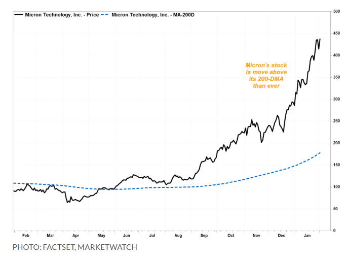 美光科技股价创下技术指标极端纪录,当前股价较长期趋势线的偏离程度已超越互联网泡沫和Windows 95热潮时期的峰值水平,历史数据显示这一信号往往预示着大幅回调。 美光近月来呈抛物线式上涨,今年1月出现自2000年2月以来最大单月涨幅——而那正是互联网泡沫破裂 前夕。人工智能驱动的供应短缺与需求激增,推动美光及部分存储企业的价格和利润双双走高。 相比之下,2000年初互联网泡沫顶峰时期,这一偏离度最高仅达98%。当美光股价在2000年7月14日见 顶时,偏离度为89%。此后三个月内股价暴跌65%,12个月后仍下跌62%。 此前的纪录出现在1995年9月11日,当时偏离度为124%。彼时美光股价因微软发布Windows 95而飙升, 新操作系统引发存储芯片强劲需求,导致供应短缺并推高价格和利润——这一场景与当前AI热潮高度 相似。那次峰值过后三个月,股价下跌42%;12个月后暴跌77%。 基本面强劲难掩估值风险 美光当前的上涨确有坚实基本面支撑。AI应用带来的供应紧张与需求增长,正在为存储芯片行业创造 有利环境。这也解释了为何绝大多数华尔街分析师维持乐观预期。 周一美光股价飙升5.5%,创下过去五个交易日中的第 ...