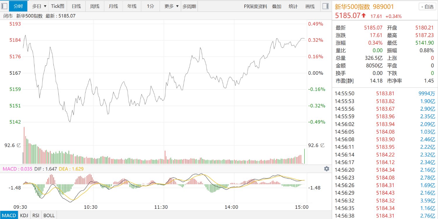 转自:新华财经 新华500指数由国家金融信息平台•新华财经发布,新华指数(北京)有限公司运营维护,指数度量A股主要大中市值股票价格水平。关于新华500指数的详 细信息,请参见新华财经客户端。 编辑:罗浩 走势上看,新华500指数(989001)10日早间小有高开,随后指数震荡下挫翻绿,午后指数持续上行,最终小幅收涨。指数盘中最高触及5187.23点,最低触 及5141.9点,成分股全天总成交额报8050亿元,成交额较上一交易日明显增加。 成分股方面,北京君正、舍得酒业、首旅酒店、中国中免等成分股涨幅居前;杰瑞股份、欣旺达、拓普集团、小商品城等成分股跌幅靠前。 新华财经北京11月10日电(胡晨曦)新华500指数(989001)11月10日收盘涨0.34%,报5185.07点。 ...