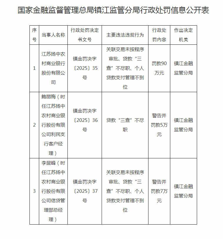 处罚通报 扬子晚报网2月24日讯(记者万凌云)春节前,国家金融监督管理总局镇江监管分局接连发布行政处罚信息, 就江苏扬中农村商业银行股份有限公司(扬中市农商行)及该行相关员工、行领导的违法违规行为,作出处罚 决定。 在该局2026年1月7日发布的处罚信息中,扬子晚报/紫牛新闻记者注意到,江苏扬中农村商业银行股份有限 公司因"关联交易未按程序审批、贷款'三查'不尽职、个人贷款支付管理不到位",被镇江金融监管分局"罚 款90万元"。 | 序 | 当事人名称 | 行政处罚决定 | 主要违法违规行为 | 行政处 | 作出决定 | | --- | --- | --- | --- | --- | --- | | 号 | | 书文号 | | 罚内容 | 机关 | | | 江苏扬中农 股份有限公 | 镇金罚决字 (2025) 35 | 关联交易未按程序 审批、贷款"三 查" 不尽职、个人 | 万元 | 监管分局 | | | 村商业银行 | | | 罚款90 | 镇江金融 | | 1 | | | | | | | | | 글 | 贷款支付管理不到 | | | | | 司 | | 位 | | | | | 鲍丽梅(时 任江苏扬中 | ...