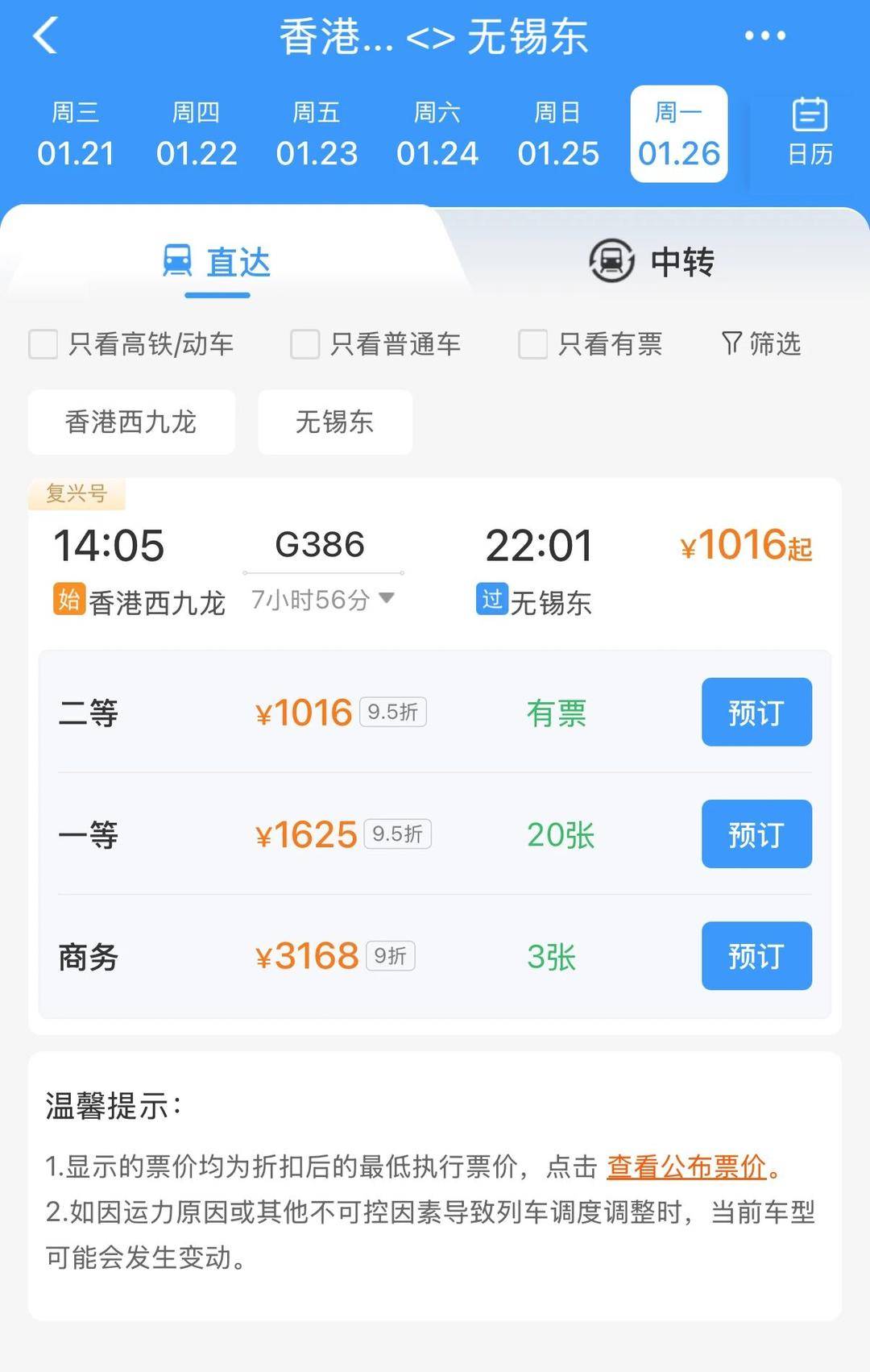 如果是从香港前往无锡,乘车时,需要前往站内B1层票务大堂,完成实名验证及检票程序,安检后前往B3层离港大堂办理香港及内地的出入境手续,之 后前往B3层所乘列车的检票口登车。 即日起,无锡去香港,可以直接搭乘高铁了,而且是直达! 1月12日凌晨,香港西九龙站到无锡东站高铁班次正式上线12306。早上8点,香港前往无锡的高铁票正式开售,二等座票价95折后价格为1016元(原价1071 元),一等座票价95折后1625元(原价1713元),商务座票价9折后3168元(原价3545元)。 | 1 | 香港 ... <> 元锡东 | | | | | --- | --- | --- | --- | --- | | 周三 周四 | 周五 周六 | 周日 | 周一 | El | | 01.21 01.22 | 01.23 01.24 | 01.25 | 01.26 | 日历 | | 層 直达 | | 国 中转 | | | | 只看高铁/动车 | 只看普通车 | 只看有票 | 7 筛选 | | | 香港西九龙 | 无锡东 | | | | | 复兴号 | | | | | | 14:05 | G386 | 22:01 | | ¥1 ...