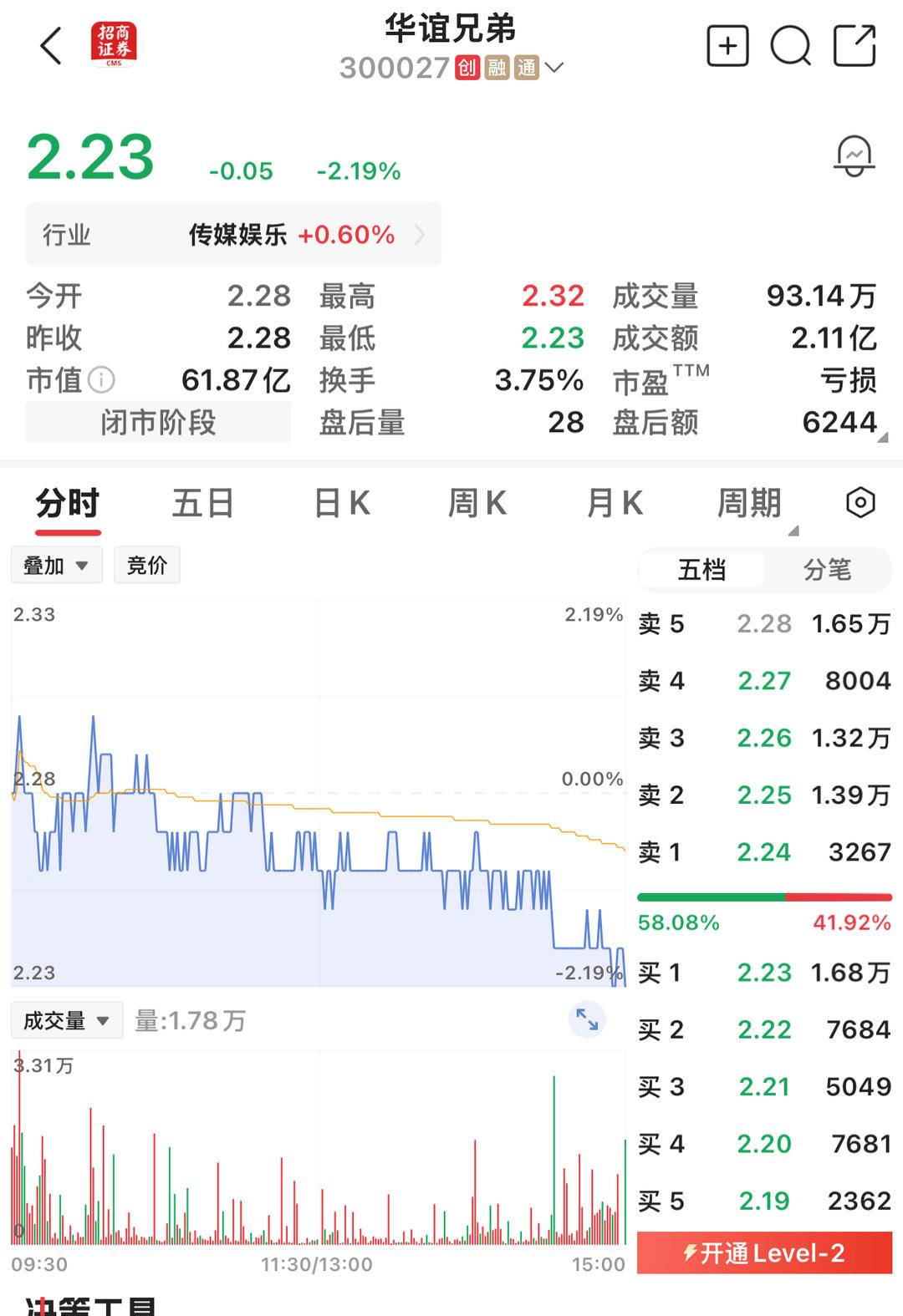 扬子晚报网12月13日讯(记者范晓林薄云峰)天眼查显示,华谊兄弟(300027)传媒股份有限公司(华谊兄弟,300027.SZ)及其法定代表人王忠军(王中军)新 增一则限制消费令,涉及广告合同纠纷案件,申请人为北京泰睿飞克科技有限公司,执行法院为北京市朝阳区人民法院。 | | | 华谊景弟 | | +1017 | | | --- | --- | --- | --- | --- | --- | | | | 300027 创 融 通 √ | | | | | 2.23 | | -0.05 -2.19% | | | | | 行业 | | 传媒娱乐 +0.60% > | | | | | 今开 | | 2.28 最高 | 2.32 成交量 | | 93.14万 | | BEIR | | 2.28 最低 | 2.23 | 成交额 | 2.11亿 | | 市值 6 61.87亿 换手 | | 3.75% | | 市屋 M | 亏损 | | 闭市阶段 | | 盘后量 | 28 | 盘后额 | 6244 | | से ब | 五日 日K | | 周K | 周期 | O | | 叠加 ▼ 竟价 | | | | 五档 | 分笔 | ...