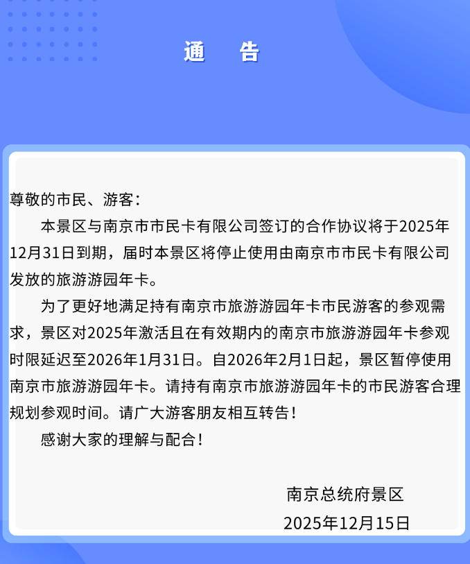 12月16日,针对这一变动,扬子晚报记者致电南京市市民卡有限公司服务热线,工作人员回应称:"公司目前正在与总统府景区积极协商中, 希望可以满足2025年度年卡用户的权益。如果协商不成,我们公司也会对2025年度年卡用户制定后续的服务方案,总之是会保障大家权益 的。"对于2026年度年卡价格是否进行调整,工作人员表示,暂未接到通知。 多年来,南京市旅游游园年卡是本地市民及长期居住者青睐的产品,持卡可在一年有效期内无限次游览多个热门景点。其效期规则为:自激活 之日起算一年有效。2025年度该年卡新用户开卡价格为260元,可游览包括明孝陵、灵谷寺、总统府、南京城墙、红山森林动物园等热门旅游 目的地在内的50+家景区(点)。 扬子晚报网12月16日讯(记者王夕悦)12月15日,南京总统府景区"将退出南京市旅游游园年卡"的消息引发南京市民广泛关注。该景区通告表 示,其与南京市市民卡有限公司的合作协议将于2025年12月31日到期,届时将停止使用由该公司发行的旅游游园年卡。为了更好地满足参观需 求,景区对2025年激活且在有效期内的南京市旅游游园年卡参观时限延迟至2026年1月31日。此后,景区暂停使用南京市旅游游园年卡 ...