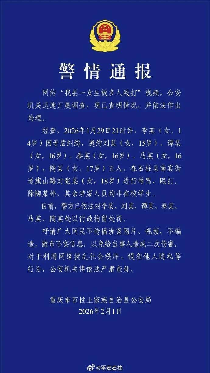 警 情 通 报 网传"我县一女生被多人殴打"视频,公安 机关迅速开展调查,现已查明情况,并依法作出 处理。 经查,2026年1月29日21时许,李某(女,1 4岁)因矛盾纠纷,邀约刘某(女,15岁)、谭某 (女,16岁)、秦某(女,16岁)、马某(女,16 岁)、陶某(女,17岁)五人,在石柱县南宾街 道旗山路对张某(女,18岁)进行辱骂、殴打。 除陶某外,其余涉案人员均非在校学生。 目前,警方已依法对李某、刘某、谭某、秦某、 马某、陶某处以行政拘留处罚。 吁请广大网民不传播涉案图片、视频,不编 造、散布不实信息,以免给当事人造成二次伤害。 对于利用网络扰乱社会秩序、侵犯他人隐私等 行为,公安机关将依法严肃查处。 重庆市石柱土家族自治县公安局 2026年2月1日 1月21日下午,湘潭市公安局雨湖分局雨湖路派出所接到辖区群众报警,称其女儿遭人殴打。民警接警 后迅速查明案情:1月18日下午,钟某某(女,15岁)与受害人刘某因琐事发生纠纷,随后将其约至某公 园内实施殴打,钟某某为泄愤还在社交媒体上恶意编造不实信息公开诋毁刘某。1月23日,钟某某被抓 获,如实供述了违法事实。进一步调查发现,钟某某在一年内还曾多次实施 ...