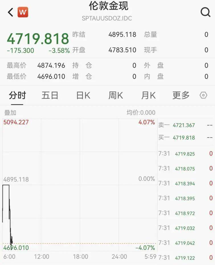 周一开盘,现货黄金白银再次跳水,随后出现拉升,然后再度下跌震荡。 2月2日贵金属早盘数据:现货黄金一度跌破4700美元,最低报4696.01美元/盎司,日跌幅超3%。 | < W | 伦敦金现 | | | | | | | --- | --- | --- | --- | --- | --- | --- | | | SPTAUUSDOZ.IDC | | | | | | | 4719818 " | | | 4895.118 | 总量 | | 0 | | -175.300 | -3.58% 十益 | | 4783.510 | 现手 | | 0 | | 最高价 | 4874.196 持 仓 | | 0 | 外 盘 | | 0 | | 最低价 | 4696.010 增 仓 | | 0 | 内 盘 | | 0 | | 分时 | 五日 | 目K | 周K | | 車零 | (0) | | 叠加 | | | 均价:0.000 | | | | | 5094.227 | | | | 4.07% 卖一 4721.367 | | | | | | | | | 2- 4719.818 | 影音 | | | | | | | 7:31 471 ...