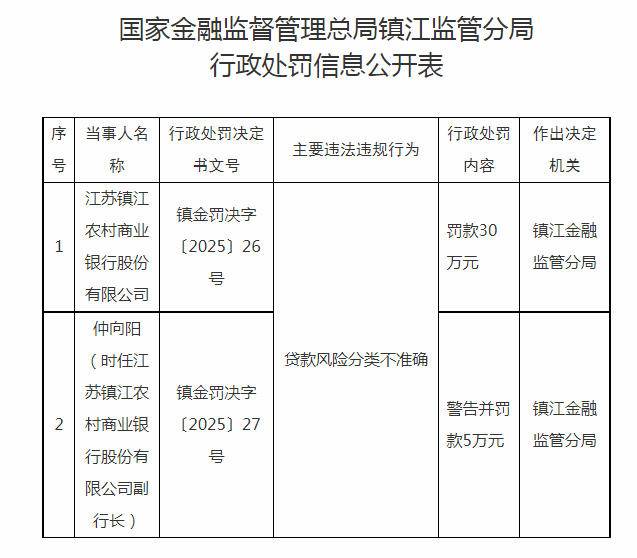 扬子晚报/紫牛新闻记者注意到,镇金罚决字〔2025〕26号、27号罚单显示,江苏镇江农村商业银行股 份有限公司及相关责任人(副行长)的主要违法违规行为均为:贷款风险分类不准确。 针对上述这一违法违规行为,国家金融监督管理总局镇江监管分局近日对江苏镇江农村商业银行股份有 限公司罚款30万元;对仲向阳(时任江苏镇江农村商业银行股份有限公司副行长)警告并处罚款5万元。 校对胡妍璐 | 序 | 当事人名 | 行政处罚决定 | 主要违法违规行为 | 行政处罚 | 作出决定 | | --- | --- | --- | --- | --- | --- | | 름 | 称 | 书文号 | | 内容 | 机关 | | 1 | 江苏镇江 农村商V 银行股份 有限公司 仲向阳 (时任江 | 镇金罚决字 (2025) 26 ap | 贷款风险分类不准确 | 罚款30 万元 | 镇江金融 监管分局 | | | 苏镇江农 | 镇金罚决字 | | 警告并罚 | 镇江金融 | | 2 | 村商业银 | (2025) 27 | | 款5万元 | 监管分局 | | | 行股份有 | 름 | | | | | | 限公司副 | | | | | | ...
