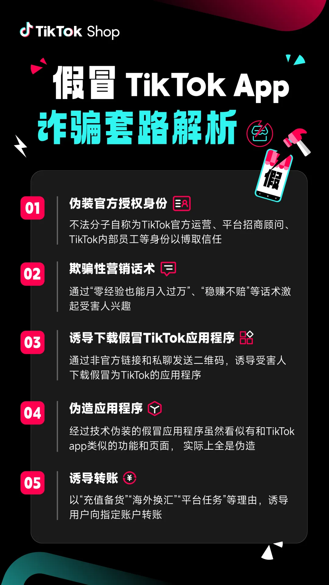 近日,TikTok Shop发布年度反诈风险提示。反诈提示梳理了2025年冒用平台名义实施诈骗的主要手法与套路,并结合典型案例,提醒商家与用户加强风 险防范。 根据TikTok Shop披露的数据,过去一年,围绕假冒应用、假网站、假客服等场景,该平台持续开展监测与治理。年内累计封堵假冒TikTok Shop诈骗域名 约3.9万个;同时持续输出风险线索与案件情报,配合警方破获全国范围内439起冒充TikTok Shop的诈骗案件。 从风险类型看,目前冒用TikTok Shop名义实施诈骗,主要有两种类型:一类是通过假冒App、仿冒网站搭建"假平台"实施诈骗;另一类是冒充平台客服、 运营指导或所谓"官方人员"身份,以代运营、培训扶持、招商等名义诱导转账。 图为假冒TikTok App(来源TikTok Shop茶话会) 假冒TikTok App诈骗套路解析(来源TikTok Shop茶话会) 在假App与仿冒网站类骗局中,不法分子通过社交平台私信或广告链接接触受害人,借助来历不明的二维码或网址将其引流至站外沟通,再以"开店指 导"等名义诱导下载假冒应用。相关假App多通过"重打包"等技术手段进行伪装,界面及部分功 ...