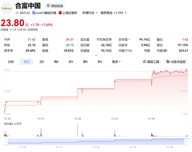 官网资料介绍,合富集团是目前唯一一家两岸双上市的医疗企业,旗下合富医疗控股股份有限公司于台 湾证券柜台买卖中心上柜,合富(中国)医疗科技股份有限公司于上海证券交易所主板上市。 合富于2000年在上海成立运营总部。公司称,其创立是为了提升大中华医疗水平,期盼让所有的医院能 够拥有世界一流的医疗设备,使绝大部分人群可以享受到世界先进的医疗技术。一直以来,合富始终以 建构优质的医疗服务体系和促进大健康产业发展为使命,通过科技及服务模式的双创新,为医院提升竞 争力。 合富中国11月14日公告,自2025年10月28日至2025年11月14日期间,公司股票连续十四个交易日中有十 二个交易日以涨停价收盘,并5次触及股价异常波动、3次触及严重异常波动情形,期间累计涨幅高达 256.29%,已明显高于同期行业及上证指数涨幅。股价短期内连续上涨,存在市场情绪过热、非理性炒 作风险,随时存在快速下跌可能。为维护广大投资者利益,公司将就上述股票交易波动情况进行核查。 经向上海证券交易所申请,公司股票将于2025年11月17日(星期一)开市起停牌,自披露核查公告后复 牌。 本文系观察者网独家稿件,未经授权,不得转载。 ...