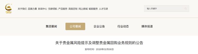 自2026年2月7日起,在业务办理时间内,对回购业务实施限额管理,包括但不限于单一客户单日累计回 购上限、单笔回购总量上限等,并实施预约制。相关限额将根据市场情况动态调整,具体内容请以中金 珠宝公司各渠道具体公告为准。若对回购业务调整有任何疑问,可通过"中国黄金"官方客服渠道咨询。 2月6日,中国黄金集团黄金珠宝股份有限公司发布公告: 近期受多重因素影响,贵金属价格波动显著加剧,不确定性持续上升。中国黄金集团黄金珠宝股份有限 公司(以下简称中金珠宝公司)提示广大消费者理性看待贵金属市场波动,提高风险防范意识,理性投 资黄金。 为适应贵金属市场风险管理要求,提升业务运营效能与客户服务水平,中金珠宝公司将对"中国黄金"品 牌所有渠道(包括线下门店及线上渠道)的贵金属回购业务规则进行调整,具体安排如下: 一、业务办理时间调整 自2026年2月7日起,在周六、周日及法定节假日等上海黄金交易所非交易日期间,暂停办理贵金属回购 业务。 二、业务交易限额管理 后续,中金珠宝公司将密切关注市场动态,适时对回购业务规则进行优化调整。若此前发布的相关回购 业务规则与本公告内容存在不一致,均以本公告为准。中金珠宝公司将持续优化服务 ...