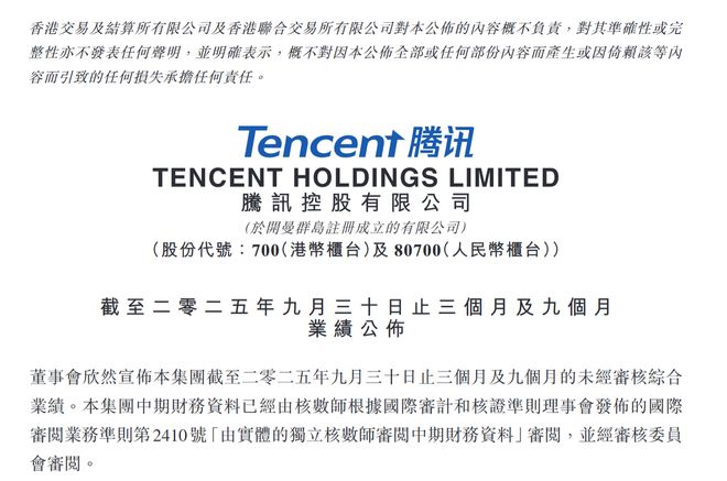 Core Insights - Tencent Holdings reported a robust performance for the third quarter and nine months ending September 30, 2025, showcasing steady growth with notable highlights [1] Financial Performance - For Q3, the company achieved revenue of 192.87 billion RMB, a year-on-year increase of 15% and a quarter-on-quarter increase of 5% [3][5] - Gross profit reached 108.80 billion RMB, reflecting a year-on-year growth of 22% and a quarter-on-quarter growth of 4% [3][5] - Profit attributable to equity holders was 63.13 billion RMB, up 19% year-on-year and 13% quarter-on-quarter [3][5] - For the nine-month period, total revenue was 557.40 billion RMB, representing a 14% year-on-year increase, while profit attributable to equity holders was 166.58 billion RMB, up 17% [6] Gaming Sector Performance - Domestic game revenue reached 42.80 billion RMB, a 15% year-on-year increase, driven by new titles and established products [6] - International game revenue surged to 20.80 billion RMB, a significant year-on-year growth of 43%, attributed to new acquisitions and the successful launch of "Dying Light: Stay Human" [7] User Metrics - The combined monthly active users of WeChat and WeChat reached 1.414 billion, a 2% year-on-year increase, while QQ mobile monthly active users declined by 8% to 517 million [8][9] AI Strategy and Efficiency - The AI strategy has yielded results in three main areas: technological breakthroughs, improved business efficiency, and ecosystem expansion [10] - The advertising services revenue grew to 36.24 billion RMB, a 21% year-on-year increase, driven by enhanced ad exposure and AI-driven targeting [14][15] Capital Expenditure - The company's capital expenditure for the quarter was 12.98 billion RMB, a decrease of 24% year-on-year and over 32% quarter-on-quarter [12]