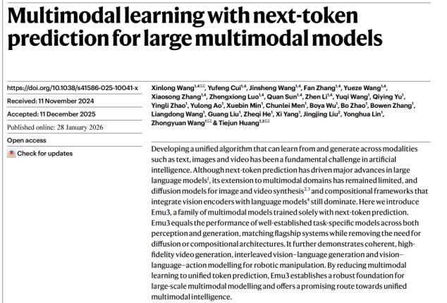 【文/观察者网专栏作者 心智观察所】 几天前,《Nature》杂志刊发了一篇来自中国的人工智能研究论文。这在顶级学术期刊上并非新鲜事, 但这篇论文的分量却非同寻常:它来自北京智源人工智能研究院,核心成果是一个名为"Emu3"的多模 态大模型,而它试图回答的问题,是整个AI领域过去五年来悬而未决的核心命题——我们能否用一种 统一的方式,让机器同时学会看、听、说、写,乃至行动? 这个问题听起来简单,但它的复杂程度足以让全球顶尖的AI实验室争论不休。 这个选择的意义,可能需要一些背景知识才能理解。 | https://doi.org/10.1038/s41586-025-10041-x | Xinlong Wang148, Yufeng Cui14, Jinsheng Wang14, Fan Zhang14, Yu | | --- | --- | | Received: 11 November 2024 | Xiaosong Zhang14, Zhengxiong Luo14, Quan Sun14, Zhen Li14, Yuqi | | | Yingli Zhao', Yulong Ao', Xuebin Mi ...