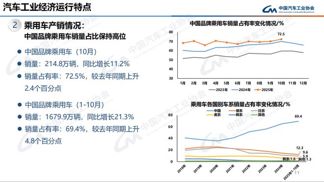 导读:从发展过程来看,伴随着中国新能源产业的发展,中国品牌乘用车销量占有率自2020年以来开始 显著增长。 中国汽车工业协会 今年1—10月,中国品牌乘用车销量为1679.9万,同比增长21.3%,销量占有率为69.4%。较去年同期上 升4.8个百分点。 从发展过程来看,伴随着中国新能源产业的发展,中国品牌乘用车销量占有率自2020年以来开始显著增 长。 此外,数据显示,10月中国汽车月度产销创同期新高,产销量分别完成335.9万辆和332.2万辆,环比同 比均有增长。中国汽车工业协会副秘书长陈士华表示,考虑到去年同期我国乘用车产销量的高基数,10 月汽车产销仍显示出快速增长的态势。 (文 / 观察者网 周盛明 编辑 / 高莘) 2025年11月11日下午,中国汽车工业协会公布2025年10月汽车产销数据及经济运行情况。 值得注意的是,10月,中国品牌乘用车销量为214.8万辆,销量占有率高达72.5%,较去年同期上升2.4 个百分点。 中国汽车工业协会 聚焦新能源汽车,10月,我国新能源汽车产销同比保持快速增长,新能源汽车新车销量达到汽车新车总 销量的51.6%,占有率首次过半。 中国汽车工业协会 具体来看 ...