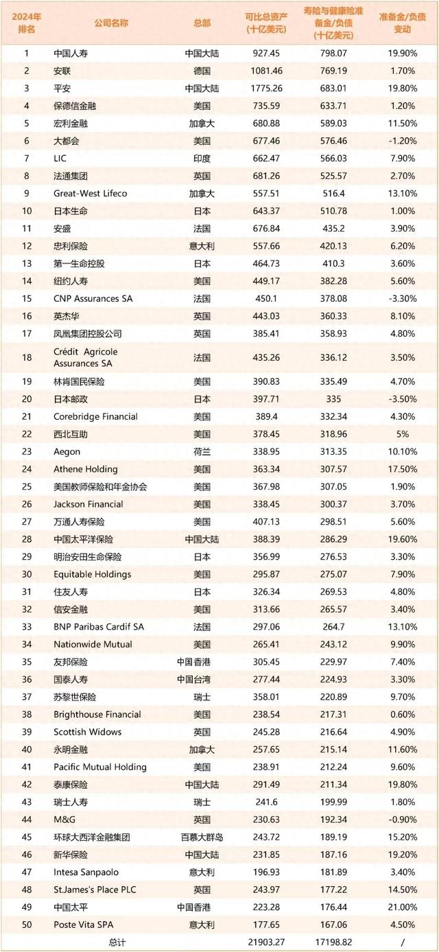 此次排名依据各公司2024年的寿险和健康险准备金,以及独立账户准备金或负债。业内人士指出,相较 于保费收入或总资产,准备金指标更能准确反映寿险公司的业务规模与长期稳健性。 | 2024年 | | | 其然花之一 | 寿险与健康险准 | 准备舍/负债 | | --- | --- | --- | --- | --- | --- | | 排名 | 公司名称 | 品当 | (十亿美元) | 备金/负债 | CAST | | | | | | (十亿美元) | | | 1 | 中国人寿 | 中国大陆 | 927.45 | 798.07 | 19.90% | | 2 | 安联 | 德国 | 1081.46 | 769.19 | 1.70% | | 3 | 本安 | 中国大陆 | 1775.26 | 683.01 | 19.80% | | 4 | 保德信金融 | 美國 | 735.59 | 633.71 | 1.20% | | 5 | 宏利金融 | 加拿大 | 680.88 | 589.03 | 11.50% | | 6 | 大都会 | 美國 | 677.46 | 576.46 | -1.20% | | 7 | LIC | ...