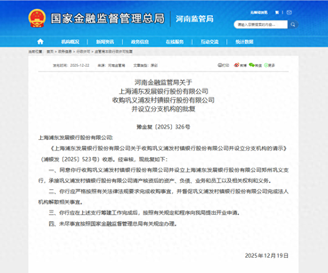 浦发系村镇银行的集体转身 浦发银行布局村镇银行的历史可追溯至2008年。当年,该行在四川绵竹发起设立首家浦发村镇银行,此 后逐步将版图扩展至全国19个省市,共计设立28家村镇银行,其中七成以上机构分布在中西部和东北 部。这一战略布局承载着"城市金融反哺农村金融"的初衷,试图将股份制银行的管理经验和资源优势输 送至县域市场。 然而十余年的运营实践暴露出独立法人模式下的诸多掣肘。截至2024年末,28家浦发村镇银行资产总额 402.21亿元,存款余额331.86亿元、贷款余额224.39亿元,结算客户143.32万户。但全年营业收入仅6.93 亿元,净利润为-0.69亿元。户均贷款40.88万元的数据显示其确实在服务小微群体,但亏损的财务状况 也说明这种商业模式难以为继。 【文/羽扇观金工作室】 12月22日,国家金融监督管理总局河南监管局发布批复,同意浦发银行收购巩义浦发村镇银行并设立郑 州巩义支行。这家成立于2009年、注册资本1.5亿元的村镇银行将告别独立法人身份,全部资产、负 债、业务及员工被纳入浦发银行统一管理框架。 这是浦发银行年内完成的第十二家村镇银行吸收合并。仅约一个月前,该行刚刚获批收购浙江平阳 ...