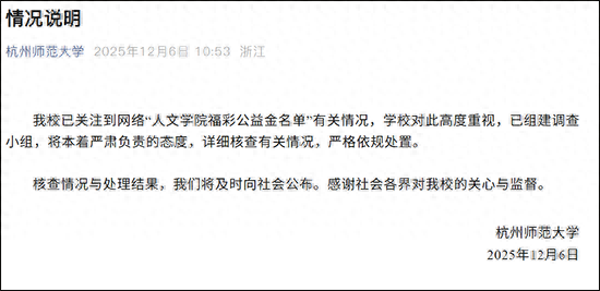 “福彩公益金受助名单疑照搬百度人名库”,杭州师范大学通报:已组建调查组
