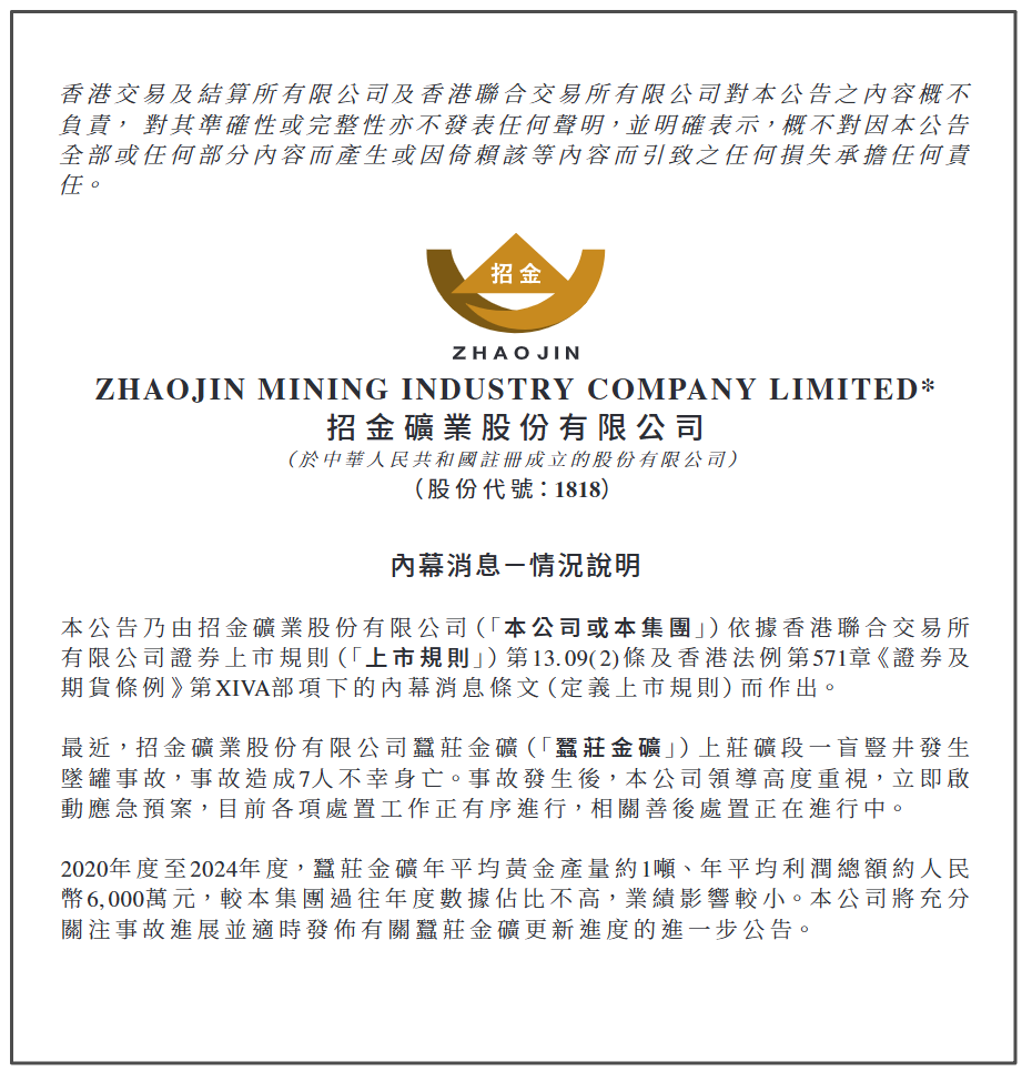 Core Viewpoint - The recent accident at the Cangzhuang Gold Mine resulted in the tragic death of 7 individuals, prompting the company to activate emergency protocols and manage the aftermath while assessing the incident's impact on operations [1][3]. Group 1: Accident Details - On February 7, a hoisting accident occurred at the Cangzhuang Gold Mine, leading to 7 fatalities [3]. - The company did not report the accident promptly, which has led to investigations by emergency and public security departments regarding potential concealment of the incident [3]. - Eleven individuals, including the mine manager and various deputy positions, have been detained for investigation [3]. Group 2: Company Operations and Financial Impact - The Cangzhuang Gold Mine has an average annual gold production of approximately 1 ton and an average annual profit of about 60 million RMB from 2020 to 2024, which is relatively small compared to the company's overall performance [1]. - The company will continue to monitor the situation and provide updates regarding the mine's status as necessary [1]. Group 3: Company Background - Shandong Zhaojin Group, established in 1974, is a large comprehensive group company with total assets exceeding 80 billion RMB and approximately 14,000 employees [4]. - The company operates in various sectors, including mining, financial services, environmental protection, and education, and has a significant presence in the market with multiple subsidiaries and holdings [4]. - Zhaojin Mining Co., Ltd. was listed on the Hong Kong main board in 2006 and has engaged in strategic acquisitions to enhance its capital operations [4].