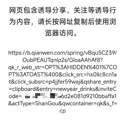 微信界面则提示:网页包含诱导分享、关注等诱导行为内容,请长按网址复制后使用浏览器访问。此 前,微信已经使用同样的方式封禁了腾讯元宝和百度文心的红包链接。 2月6日,阿里千问APP正式开启"千问请客瓜分30亿"活动。用户如果使用相关链接邀请新用户,还可以 获得更多奖励。但观察者网注意到,若把该链接发送至微信,将会被微信平台屏蔽。 此外,观察者网还注意到,目前用户如果在千问APP点击分享活动到微信,自动复制的文本已经修改为 了口令形式,与元宝和文心的模式相同。 此前,对于封禁元宝的红包分享链接,微信官方曾回应称,其相关春节营销活动存在通过"做任务""领 红包"等方式诱导用户高频分享链接到微信群等场景,干扰平台生态秩序、影响用户体验、对用户造成 骚扰。经官方研判,对元宝的违规链接进行处置,限制其在微信内直接打开。 本文系观察者网独家稿件,未经授权,不得转载。 ...