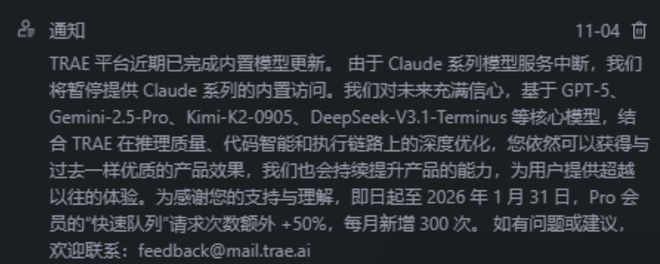 Core Insights - The article discusses the impact of Anthropic's ban on the Claude model for Chinese companies, leading to the removal of Claude from AI programming tools like Trae and CodeBuddy [1][3][8] - The ban has created opportunities for domestic AI models to fill the gap left by Claude, with companies like Zhiyu and Kimi launching migration plans for developers [9][12] Group 1: Company Actions - ByteDance's Trae international version has removed access to the Claude model as of November 4, following a service adjustment notification to users [1][4] - Tencent's CodeBuddy international version had already removed the Claude model by October 1, replacing it with models like OpenAI's GPT-5 and Gemini-2.5-Pro [3][8] - Trae has offered Pro members an additional 50% request quota as compensation for the removal of Claude, valid until January 31, 2026 [6] Group 2: Market Response - The removal of Claude has accelerated the development of domestic AI models, with companies like Zhiyu and Kimi quickly introducing alternatives [9][12] - Zhiyu has launched a "migration plan" for Claude API users, promoting its GLM model as a cost-effective alternative, priced at one-seventh of Claude's cost [9][12] - Kimi updated its model on the same day the ban was announced, positioning it as a competitor to Claude at a significantly lower price point [12] Group 3: Industry Trends - The ban on Claude has prompted a shift in the AI programming landscape, with domestic models gaining traction and attracting attention from both local developers and international companies [9][12] - Major Chinese tech firms are increasingly focusing on developing their own integrated development environments (IDEs) to compete in the AI space, with products like Trae, CodeBuddy, and Alibaba's Qoder emerging [12][13] - ByteDance has restricted internal use of third-party AI development tools, promoting its own Trae tool among employees, which has seen over 1 million monthly active users [13]