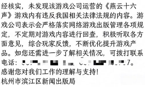 近日,游戏《燕云十六声》上线新时装引发网友争议。12月27日,有投诉人陆续在社交平台晒出政府的 回复,表示未发现《燕云十六声》游戏内有违反我国相关法律法规内容。 此前,《燕云十六声》已公开回复,"飞白成诗"系列时装上线后实机演示出现异常,部分故障,游戏当 日已安排紧急修复,随后再次发布优化方案。 游戏官方公告显示,外观"飞白成诗"的染色问题已于25日凌晨进行了首批修复,现女款外观已恢复染色 功能,男款仍在紧急修复中……并将尽快完成男款修复并开放染色。此外,还会在后续更新中为男女时 装增加了不同裁造方案。 在随后游戏官方客服给玩家的回应也显示,25日"修复了'飞白成诗'女款上身与裙摆部分区域染色效果 异常的情况;修复了'飞白成诗'女款背后模型细节显示错误的情况。 燕云十六声新外观被指擦边,你们了解这个 事情吗 游侠您好~非常感谢您对外观内容的关注, 在12月25日调整并优化了「飞白成诗」女款 下装靴子的染色区域,以支持更自由的配色 方案;修复了「飞白成诗」女款上身与裙摆 部分区域染色效果异常的情况;修复了「飞 白成诗」女款后背模型细节显示错误的情 况。 ...