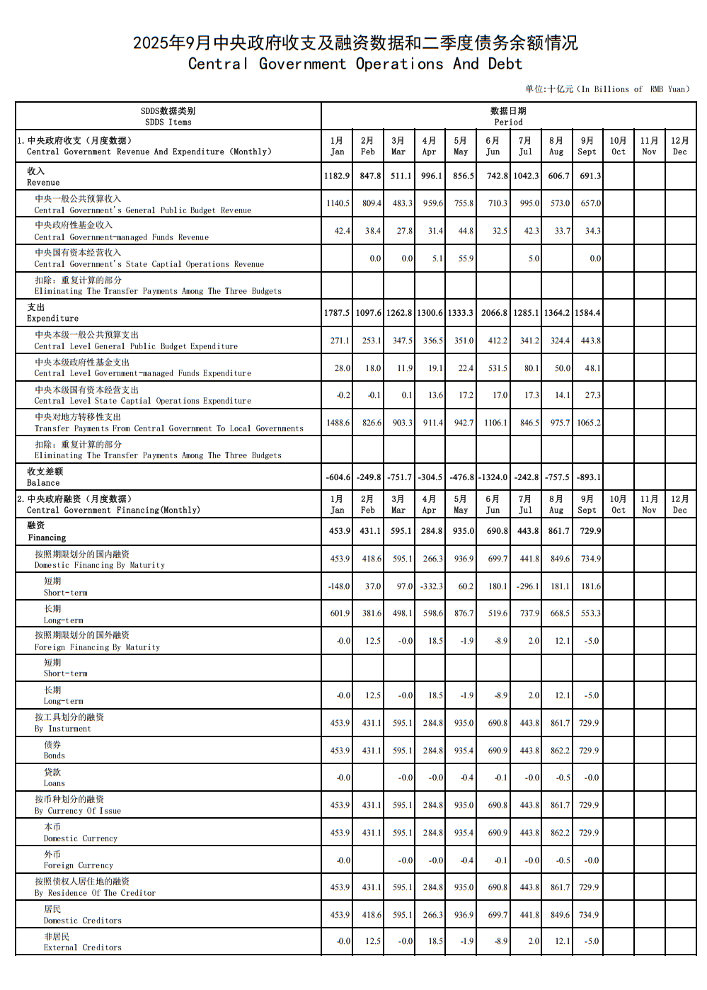 Central Government Revenue and Expenditure - In September 2025, the central government revenue was 691.3 billion RMB, while the expenditure was 1584.4 billion RMB, resulting in a deficit of 893.1 billion RMB for the month [1][3][4] - The central government's general public budget revenue for September was 657.0 billion RMB, and the government-managed funds revenue was 34.3 billion RMB [3][5] - The total central government expenditure for the second quarter was 3796.4 billion RMB, with a significant portion allocated to transfer payments to local governments [4][6] Central Government Debt - As of the second quarter of 2025, the central government debt balance stood at 37963.8 billion RMB, an increase from 36055.7 billion RMB in the first quarter [4][6] - Domestic debt accounted for 37576.8 billion RMB of the total debt, with short-term debt at 7434.0 billion RMB and long-term debt at 30142.8 billion RMB [4][6] - Foreign debt was recorded at 387.0 billion RMB, with the majority being long-term [4][6] Financing Activities - In September 2025, the central government financing amounted to 729.9 billion RMB, primarily through bonds [3][4] - Domestic financing by maturity showed a total of 734.9 billion RMB, with long-term financing being the predominant source [3][4] - The financing data does not include payments for the principal of national debt, indicating a focus on operational financing rather than debt repayment [5][6]