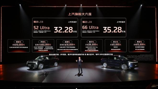【文/观察者网 潘昱辰 编辑/高莘】11月12日,智己汽车首款大型六座SUV智己LS9正式上市。新车推出 两款增程版本:52 Ultra版售价为32.28万元,66 Ultra版售价为35.28万元,比预售价格便宜约1.4万元。 作为上汽集团最高端新能源汽车品牌,智己近年面临激烈的市场竞争环境。为推动销量的增长,智己于 今年8月发布恒星超级增程技术,宣告这一过去只生产纯电动车型的新能源品牌,正式投入插电混动 (增程式)路线。搭载这一技术的智己首款增程车型——新一代智己LS6已先期上市,并将该品牌车型 的价格首次下探至20万元以内。 智能化方面,智己LS9车内配备多屏系统,拥有一体式27.1英寸屏幕和15.6英寸副驾娱乐屏。智能驾驶 硬件标配520线超视域激光雷达和英伟达Thor芯片,支持城市NOA、高速NOA等功能,还支持AI越野补 盲功能,定制360越野影像、专属越野卡片,并配备雨夜模式2.0、DZT动态区域追踪和一体式超广域智 慧探射灯。 动力方面,智己LS9搭载恒星超级增程,最大综合功率390kW,最大扭矩670N·m,0-100km/h加速时间 为4.9s。 续航方面,智己LS9提供两种电池组选择,C ...
