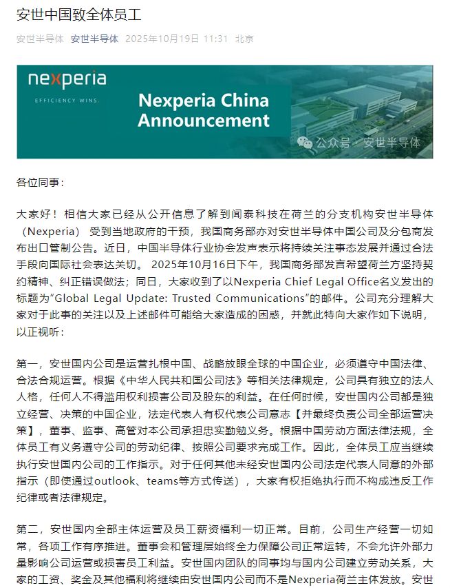 【文/观察者网 潘昱辰 编辑/高莘】10月19日,安世半导体中国公司通过微信公众号发布《安世中国致 全体员工》的公开信。信中强调,安世国内公司是运营扎根中国、战略放眼全球的中国企业,必须遵守 中国法律、合法合规运营。在任何时候,安世国内公司都是独立经营、决策的中国企业。全体员工应当 继续执行安世国内公司的工作指示。对于任何其他未经安世国内公司法定代表人同意的外部指示(即使 通过outlook、teams等方式传送),员工有权拒绝执行而不构成违反工作纪律或者法律规定。 安世中国同时强调,安世国内全部主体运营及员工薪资福利一切正常,各项工作有序推进。董事会和管 理层始终全力保障公司正常运转,不会允许外部力量影响公司运营或损害员工利益。安世国内团队的同 事均与国内公司建立劳动关系,员工的工资、奖金及其他福利将继续由安世国内公司而不是Nexperia荷 兰主体发放。安世国内有能力、有责任、有意愿保障全体员工权益,并继续营造安心的工作环境。 《安世中国致全体员工》 安世半导体 另据英国《金融时报》报道,荷兰经济事务部10月20日表示,荷兰经济事务大臣文森特·卡雷曼斯 (Vincent Karremans)预计将在未来几 ...