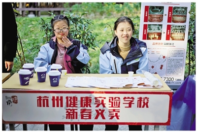 市集里的温情与欢乐远不止于此。互动游戏区,在现场工作人员的热情鼓励下,两位年过七旬的老 人拥抱在一起,随后收获了一本寓意吉祥的新年挂历作为奖励,温馨的一幕引得周围居民纷纷鼓掌。朝 晖幼儿园的萌娃们则带来了新年大合唱,稚嫩的歌声传递着纯真的喜悦,现场被举着手机拍照记录的家 长们围得水泄不通。 此次塘南社区公园的新春市集,处处洋溢着浓浓的烟火气与人情味。新年写福、新春大合唱、糖葫 芦大派送、趣味互动游戏……丰富多样的活动内容,让社区居民在家门口就能畅快购物、尽情玩耍,提 前沉浸式感受新年的热闹氛围。 "我们鼓励学生多参与社会活动,感谢塘南社区经常给我们机会,每次我们都挑选学生轮流体验, 他们需要锻炼社会实践能力,以前他们出来见到人都不敢讲话,现在大声吆喝起来都一点不怵了。"杭 州健康实验学校孙老师说,他们的学生此前被媒体报道后,还有爱心企业主动来联系,帮助毕业生安排 了工作,所以多参与社会活动,对于他们来说是好事情。 "叔叔、阿姨,快来尝尝我们的现磨咖啡,免费的啊!"近日,热闹的朝晖塘南社区迎新春市集上, 来自杭州健康实验学校的学生们向来来往往的居民们大声吆喝着。除了现磨咖啡,他们还在集市上摆出 了定制拼豆和儿童 ...
