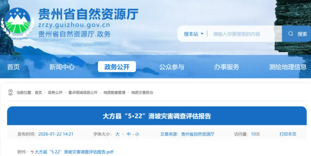 | | 大方县"5•22"滑坡灾害调查评估报告 | | | | --- | --- | --- | --- | | 发布时间:2026-01-22 14:21 | 字体大小: 大 - 中 - 小 文章来源:贵州省自然资源厅 | 访问量:10次 | 打印本页 | 2025年5月22日,贵州省毕节市大方县果瓦乡庆阳村茶林组突发山体滑坡灾害,造成19人死亡失踪(其中死亡7人,失踪12人)。此次灾害规模级别为大型 滑坡,灾情等级属大型灾害范畴。 据新华社消息,贵州省自然资源厅近日通报大方县"5·22"滑坡的调查结果。调查指出,滑坡原因主要为山体结构不稳,加之极端强降雨诱发,导致灾害发 生。 从地形地貌看,滑坡区位于侵蚀陡斜坡地带,地形相对高差较大。滑坡左右两侧地势相对较高,利于地表水和地下水向滑坡区汇集;底部受河流冲刷侧蚀 作用,坡度较陡,不利于斜坡稳定。 气象信息显示,滑坡发生前24小时,距滑坡区最近的光明气象观测站降水量达222.3毫米,累计降雨量超过当地历史极值。由于降雨强度过大,斜坡排水 不畅,导致岩土处于饱和或超饱和状态,加剧了斜坡变形破坏过程。 灾害发生后,国家、省、市、县、乡五级联动,调集各类救援力量和 ...