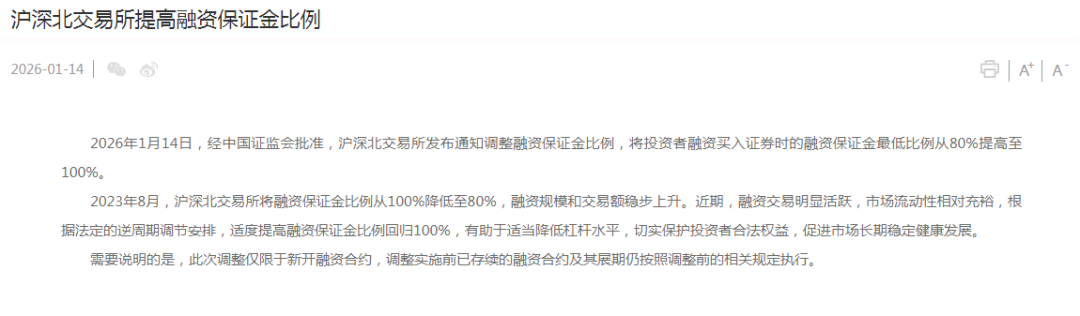 2026年1月14日,经中国证监会批准,沪深北交易所发布通知调整融资保证金比例,将投资者融资买入证券时的融资保证金最低比例从80%提高至100%。 2023年8月,沪深北交易所将融资保证金比例从100%降低至80%,融资规模和交易额稳步上升。近期,融资交易明显活跃,市场流动性相对充裕,根据法 定的逆周期调节安排,适度提高融资保证金比例回归100%,有助于适当降低杠杆水平,切实保护投资者合法权益,促进市场长期稳定健康发展。 需要说明的是,此次调整仅限于新开融资合约,调整实施前已存续的融资合约及其展期仍按照调整前的相关规定执行。 A股融资保证金比例,此前也发生过多次演变。 2006年8月,沪深交易所发布融资融券交易试点实施细则,投资者融资买入证券时,融资保证金比例不得低于50%,即最高可达两倍杠杆。2015年11月, 沪深交易所修订细则,将融资保证金比例从50%上调至100%,即最高一倍杠杆。再是2023年8月,沪深北交易所将融资保证金比例从100%降低至80%。 对于此次调整的原因,根据交易所发布的通知称,近期,融资交易明显活跃,市场流动性相对充裕,根据法定的逆周期调节安排,适度提高融资保证金比 例回归100% ...