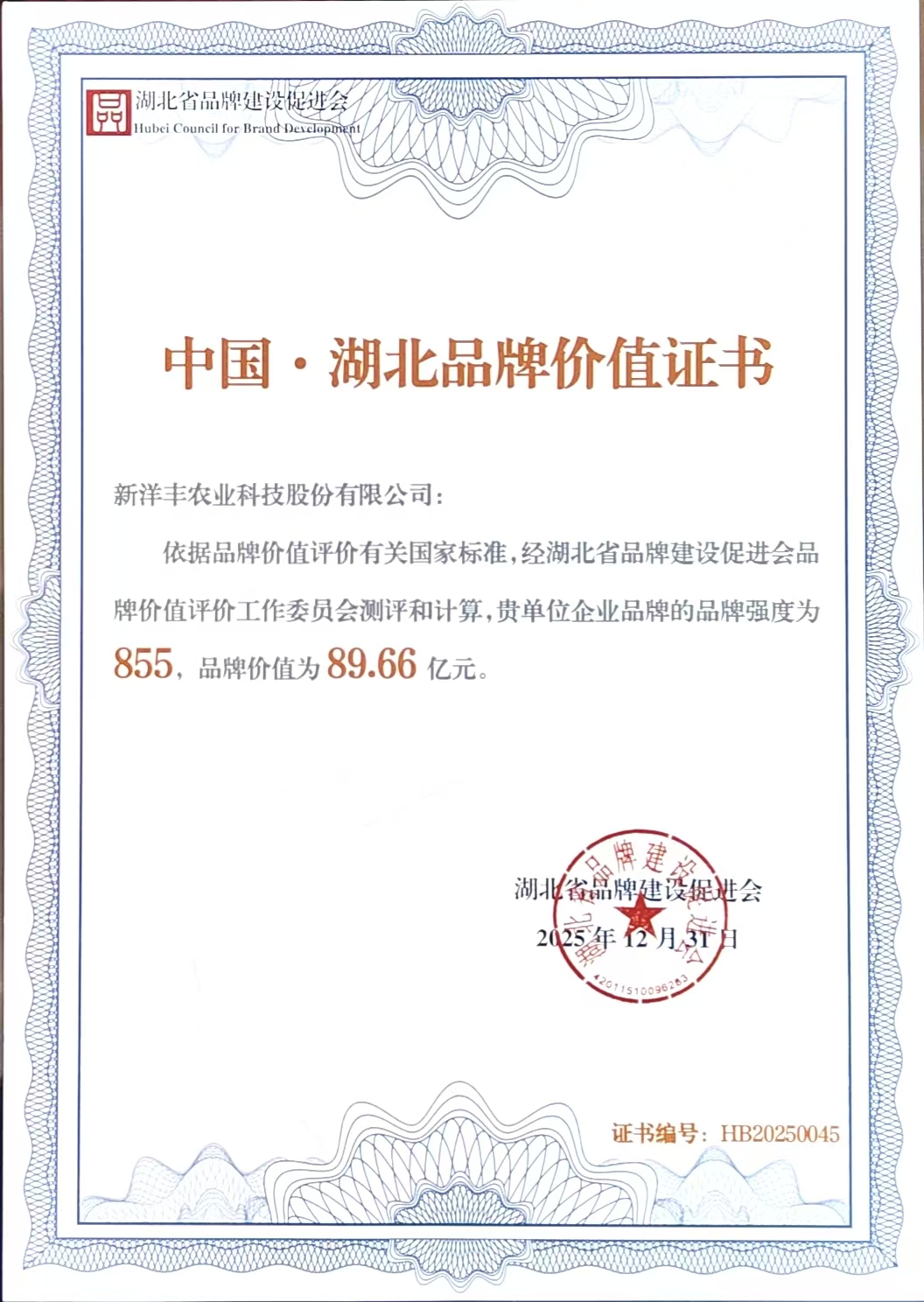 最新出炉!新洋丰荣获“中国·湖北品牌价值证书”
