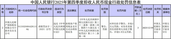 人保财险宁波市北仑支公司被罚 拒收人民币现金