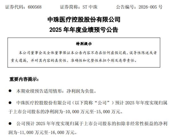 公告指出,业绩预亏主要有两大原因: 1月23日晚间,中珠医疗控股股份有限公司(以下简称"中珠医疗")发布年度业绩预亏公告:预计全年归 属于上市公司股东的净利润亏损1亿元至1.5亿元,扣除非经常性损益后亏损1.1亿元至1.6亿元。 一方面,受房地产市场环境影响,房价下降,商业资产产生资产减值损失,商业地产项目联营企业其他 应收款计提坏账损失金额较大。 第二,北京忠诚肿瘤医院项目无法正常经营产生亏损,现已执行法院判决实施腾退。 公开资料显示,中珠医疗2001年5月在上交所挂牌上市,主营业务为医药制造、医疗服务、医疗器械、 房地产。中珠俊天(北京)医疗科技有限公司是中珠医疗控股子公司,是北京忠诚肿瘤医院母公司。据报 道,早在2022年10月已取得《医疗机构执业许可证》的北京忠诚肿瘤医院,因房屋租赁合同纠纷、工程 施工合同诉讼等因素长期处于待开业状态。2025年3月13日,北京市卫生健康委发布《关于同意北京忠 诚肿瘤医院停业的批复》,正式批复该院的停业申请,同意其自2025年3月5日至2026年3月4日停业。 (中国经济网记者韩璐) ...
