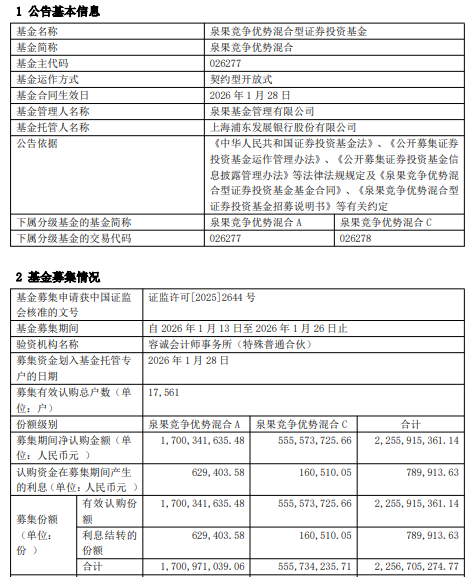 中国经济网北京1月30日讯 昨日,泉果基金发布泉果竞争优势混合型证券投资基金基金合同生效公 告。 | 基金名称 | 泉果竞争优势混合型证券投资基金 | | --- | --- | | 基金简称 | 泉果竞争优势混合 | | 基金主代码 | 026277 | | 基金运作方式 | 契约型开放式 | | 基金合同生效日 | 2026年1月28日 | | 基金管理人名称 | 泉果基金管理有限公司 | | 基金托管人名称 | 上海浦东发展银行股份有限公司 | | 公告依据 | 《中华人民共和国证券投资基金法》、《公开募集证券 | | | 投资基金运作管理办法》、《公开募集证券投资基金信 息披露管理办法》等法律法规规定及《泉果竞争优势混 | | | 合型证券投资基金基金合同》、《泉果竞争优势混合型 | | | 证券投资基金招募说明书》等有关约定 | | 下属分级基金的基金简称 | 泉果竞争优势混合 A 泉果竞争优势混合 C | | 下属分级基金的交易代码 | 026277 026278 | 募集期间净认购金额2,255,915,361.14元,认购资金在募集期间产生的利息789,913.63元,募集份额 合计2,256 ...