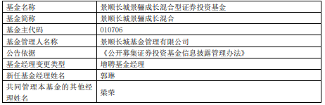 景顺长城景骊成长混合A成立于2021年05月07日,截至2026年01月07日,其今年来收益率为5.90%,成 立来收益率为-11.43%,累计净值为0.8856。景顺长城景骊成长混合C成立于2025年4月18日,成立来收 益率为16.70%。 | 基金名称 | 景顺长城景骊成长混合型证券投资基金 | | --- | --- | | 基金简称 | 景顺长城景骊成长混合 | | 基金主代码 | 010706 | | 基金管理人名称 | 景顺长城基金管理有限公司 | | 公告依据 | 《公开募集证券投资基金信息披露管理办法》 | | 基金经理变更类型 | 增聘基金经理 | | 新任基金经理姓名 | 郭琳 | | 共同管理本基金的其他经 | 梁荣 | | 理姓名 | | 中国经济网北京1月8日讯昨日,景顺长城基金公告,景顺长城景骊成长混合增聘郭琳。 郭琳曾任大成国际资产管理有限公司投资研究部高级研究员。2016年8月加入景顺长城,历任研究部研 究员、专户投资部投资经理、研究部基金经理助理,自2022年7月起担任股票投资部基金经理,现任研 究部基金经理。 ...