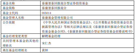 黄钟离任泰康景泰回报混合