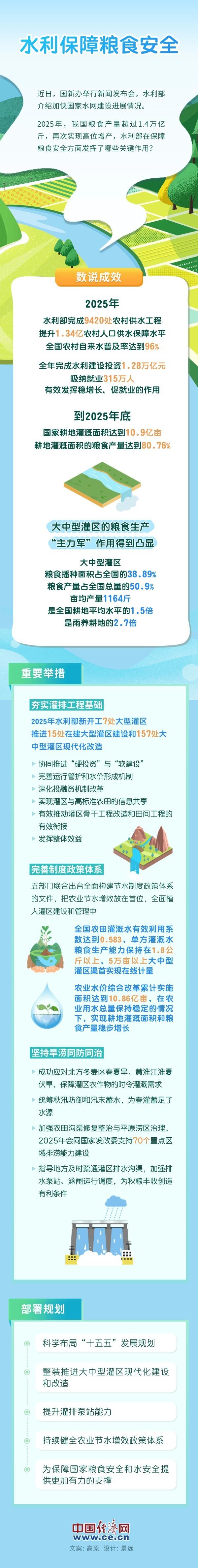 Core Viewpoint - The Ministry of Water Resources plays a crucial role in ensuring food security in China by accelerating the construction of the national water network, aiming for a grain output exceeding 1.4 trillion jin by 2025 [1] Group 1: Achievements - The Ministry has completed 9,420 rural water supply projects, improving water security for 134 million rural residents, with a national rural tap water coverage rate reaching 96% [2] - A total of 1.28 trillion yuan has been invested in water conservancy construction throughout the year, creating 3.15 million jobs and effectively stabilizing growth and promoting employment [3] - By the end of 2025, the irrigated area of arable land is expected to reach 1.09 billion mu, with the grain output from irrigated land accounting for 80.76% [3] Group 2: Key Measures - The Ministry plans to start construction on 7 large irrigation districts and advance the modernization of 15 ongoing large irrigation districts and 157 medium and large irrigation districts [4] - A comprehensive water-saving policy framework has been established, prioritizing agricultural water-saving and efficiency, with the effective utilization rate of irrigation water reaching 0.583 [4] - The Ministry aims to enhance the operation and maintenance of irrigation systems, deepen investment and financing reforms, and ensure effective coordination between irrigation districts and high-standard farmland [4] Group 3: Planning and Coordination - The "14th Five-Year" development plan focuses on modernizing and renovating medium and large irrigation districts, addressing seasonal irrigation needs for crops in various regions [7] - The Ministry will support the construction of drainage capacity in 70 key areas to improve flood control and drainage systems by 2025 [7] - Local authorities are guided to promptly clear drainage ditches and enhance the operation of drainage pumps and sluices to create favorable conditions for autumn harvests [7]