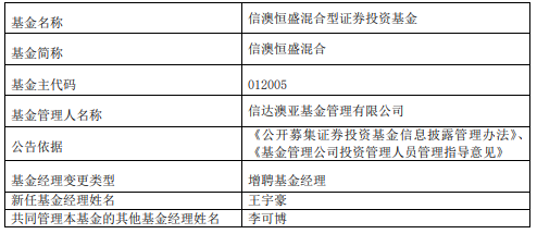 中国经济网北京1月8日讯 今日,信达澳亚基金公告,信澳恒盛混合增聘王宇豪。 信澳恒盛混合A/C成立于2021年09月24日,截至2026年01月07日,其今年来收益率为0.17%、 0.17%,成立来收益率为-1.47%、-3.14%,累计净值为0.9853、0.9686。 (责任编辑:康博) | 基金名称 | 信澳恒盛混合型证券投资基金 | | --- | --- | | 基金简称 | 信澳恒盛混合 | | 基金主代码 | 012005 | | 基金管理人名称 | 信达澳亚基金管理有限公司 | | 公告依据 | 《公开募集证券投资基金信息披露管理办法》、 《基金管理公司投资管理人员管理指导意见》 | | 基金经理变更类型 | 增聘基金经理 | | 新任基金经理姓名 | 王宇豪 | | 共同管理本基金的其他基金经理姓名 | 李可博 | 王宇豪曾任中泰证券股份有限公司研究员、广发证券股份有限公司分析师,2022年10月加入信达澳 亚基金管理有限公司先后任研究员、投资经理。现任公司基金经理。 ...