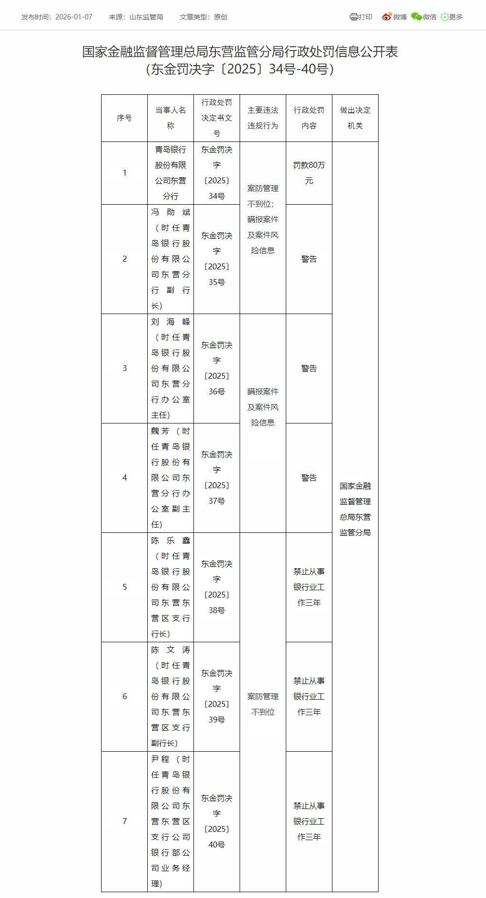 Summary of Key Points Core Viewpoint - The Qingdao Bank Dongying Branch has been penalized for inadequate case prevention management and for concealing case and risk information, resulting in a fine of 800,000 yuan [1]. Regulatory Actions - The Dongying Regulatory Bureau of the National Financial Supervision Administration has issued multiple penalties against individuals associated with Qingdao Bank Dongying Branch for various violations [2][3][4][5][6][7]. - The following individuals received warnings: - Feng Xunbin, former Deputy Branch Manager [2] - Liu Haifeng, former Office Director [3] - Wei Fang, former Deputy Office Director [4] - The following individuals have been banned from engaging in banking activities for three years: - Chen Lexin, former Branch Manager of Dongying District [5] - Chen Wentao, former Deputy Branch Manager of Dongying District [6] - Yin Cheng, former Company Business Manager of Dongying District [7].