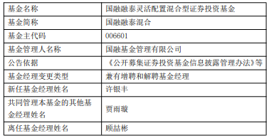 中国经济网北京1月26日讯 近日,国融基金公告,国融融泰混合增聘许银丰,顾喆彬离任。 许银丰曾任中信证券股份有限公司资产管理部研究员、交易员,中国国际金融股份有限公司资产管 理部交易员,中金基金管理有限公司交易部交易员,太平洋证券股份有限公司资产管理总部投资经理、 副总经理、投资总监等,国融基金管理有限公司非公募投资业务部总监,现任国融基金管理有限公司首 席投资官、研究部总监、混合投资部总监。 国融融泰灵活配置混合A/C成立于2019年01月30日,截至2026年01月23日,其今年来收益率 为-0.01%、-0.01%,成立来收益率为-22.08%、-22.50%,累计净值为0.7954元、0.7914元。 | 基金名称 | 因融融泰灵活配置混合型证券投资基金 | | --- | --- | | 基金简称 | 因融融泰混合 | | 基金主代码 | 006601 | | 基金管理人名称 | 国融基金管理有限公司 | | 公告依据 | 《公开募集证券投资基金信息披露管理办法》等 | | 基金经理变更类型 | 兼有增聘和解聘基金经理 | | 新任基金经理姓名 | 许银丰 | | 共同管理本基金的其他基 | 開南玻 ...