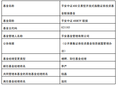 平安中证A50ETF联接增聘李严 翁欣离任