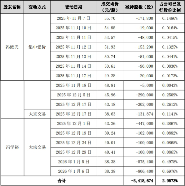 中国经济网北京1月8日讯 澄天伟业(300689.SZ)昨日晚间发布关于控股股东、实际控制人及一致行 动人权益变动触及1%整数倍暨减持计划实施完毕的公告。 公司近日收到公司实际控制人、持股5%以上股东、董事长兼总经理冯学裕及其一致行动人冯澄天 出具的书面告知函,获悉股东减持计划已实施完毕,且冯学裕及一致行动人合计持有股份比例从 53.00%下降至51.71%,触及1%的整数倍。 2025年11月7日,冯澄天通过集中竞价方式减持171,800股,成交均价为55.70元/股;2025年11月10 日,冯澄天通过集中竞价方式减持19,000股,成交均价为54.88元/股;2025年11月11日,冯澄天通过集 中竞价方式减持48,000股,成交均价为53.57元/股;2025年11月12日,冯澄天通过集中竞价方式减持 153,200股,成交均价为51.93元/股;2025年11月13日,冯澄天通过集中竞价方式减持51,000股,成交均 价为50.74元/股;2025年11月14日,冯澄天通过集中竞价方式减持96,000股,成交均价为50.61元/股; 2025年11月17日,冯澄天通过集中竞价方式减持20,000股, ...