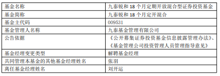 | 基金名称 | 九泰锐和18个月定期开放混合型证券投资基金 | | --- | --- | | 基金简称 | 九泰锐和 18个月定开混合 | | 基金主代码 | 009531 | | 基金管理人名称 | 九泰基金管理有限公司 | | 公告依据 | 《公开募集证券投资基金信息披露管理办法》、 | | | 《基金管理公司投资管理人员管理指导意见》 | | 基金经理变更类型 | 解即其令经理 | | 共同管理本基金的其他基金经理姓名 | 张羽 | | 离任基金经理姓名 | 刘开运 | (责任编辑:康博) 九泰锐和18个月定开混合成立于2020年12月03日,截至2025年12月31日,其2025年来收益率为 12.92%,成立来收益率为-28.19%,累计净值为0.7405。 中国经济网北京1月7日讯 今日,九泰基金公告,刘开运离任九泰锐和18个月定开混合。 刘开运2010年7月至2011年6月,就职于毕马威华振会计师事务所,任审计师。2011年7月至2014年7月, 就职于昆吾九鼎投资管理有限公司,任投资经理、合伙人助理。2014年7月加入九泰基金管理有限公司,曾 任总裁助理、致远权益投资部总经理兼执行投资总监 ...