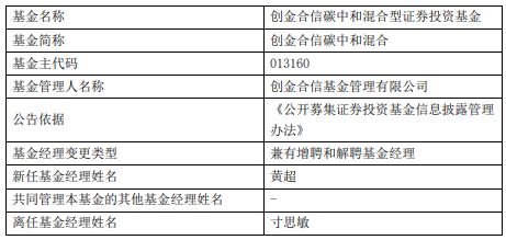 中国经济网北京1月7日讯 今日,创金合信基金公告,创金合信碳中和混合增聘黄超,寸思敏离 任。 黄超2016年8月加入前海欣得利基金管理(深圳)有限公司,任投资部投资助理,2018年4月加入新 疆前海联合基金管理有限公司,任研究部研究员,2020年5月加入明亚基金管理有限责任公司,任研究 部研究员,2021年4月加入招商证券资产管理有限公司,任权益投资部研究员,2023年2月加入创金合信 基金管理有限公司,曾任研究员,现任基金经理。 (责任编辑:康博) 创金合信碳中和混合A/C成立于2021年09月22日,截至2026年01月06日,其今年来收益率为 1.07%、1.07%,成立来收益率为-43.31%、-44.27%,累计净值为0.5669、0.5573。 | 基金名称 | 创金合信碳中和混合型证券投资基金 | | --- | --- | | 基金简称 | 创金合信碳中和混合 | | 基金主代码 | 013160 | | 基金管理人名称 | 创金合信基金管理有限公司 | | 公告依据 | 《公开募集证券投资基金信息披露管理 办法》 | | 基金经理变更类型 | 兼有增聘和解聘基金经理 | | 新任基金经理姓名 ...