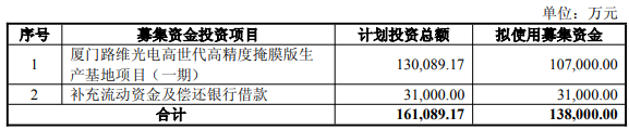 中国经济网北京1月22日讯 路维光电(688401.SH)昨日股价创历史新高。路维光电昨晚披露的2026年 度向特定对象发行A股股票预案显示,本次向特定对象发行股票募集资金总额不超过人民币138,000.00 万元(含本数),扣除发行费用后,用于以下项目的投资:厦门路维光电高世代高精度掩膜版生产基地 项目(一期)、补充流动资金及偿还银行借款。 | | | | 单位: 万元 | | --- | --- | --- | --- | | 居号 | 募集资金投资项目 | 计划投资总额 | 拟使用募集资金 | | | 厦门路维光电高世代高精度掩膜版生 产基地项目(一期) | 130,089.17 | 107,000.00 | | 2 | 补充流动资金及偿还银行借款 | 31,000.00 | 31,000.00 | | | 合计 | 161,089.17 | 138,000.00 | 路维光电的保荐机构(主承销商)是国信证券,保荐代表人是王琳、颜利燕。路维光电首次公开发 行新股的发行费用总额为7,549.62万元,其中国信证券获得保荐费用283.02万元、承销费用5,205.32万 元,合计5488.34万元。 维光电 ...
