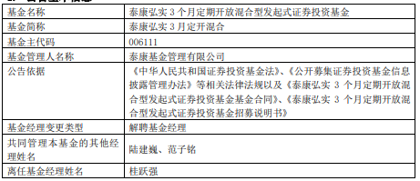 | 基金名称 | 泰康弘实3个月定期开放混合型发起式证券投资基金 | | --- | --- | | 基金简称 | 泰康弘实 3月定开混合 | | 基金主代码 | 006111 | | 基金管理人名称 | 泰康基金管理有限公司 | | 公告依据 | 《中华人民共和国证券投资基金法》、《公开募集证券投资基金信息 披露管理办法》等相关法律法规以及《泰康弘实 3个月定期开放混 | | | 合型发起式证券投资基金基金合同》、《泰康弘实 3个月定期开放混 | | | 合型发起式证券投资基金招募说明书》 | | 基金经理变更类型 | 解聘基金经理 | | 共同管理本基金的其他经 | 陆建巍、范子铭 | | 理姓名 | | | 离任基金经理姓名 | 桂跃强 | 桂跃强2015年8月加入泰康公募,担任公募事业部权益投资负责人,现任泰康基金权益投资部负责人、 股票基金经理。曾任石油化工科学研究院工程师,新华基金管理有限公司基金管理部副总监、基金经理 等职务。 泰康弘实3月定开混合成立于2018年8月23日,截至2025年12月31日,其2025年收益率为24.00%,成立 来收益率为81.59%,累计净值为1.8056。 中国 ...