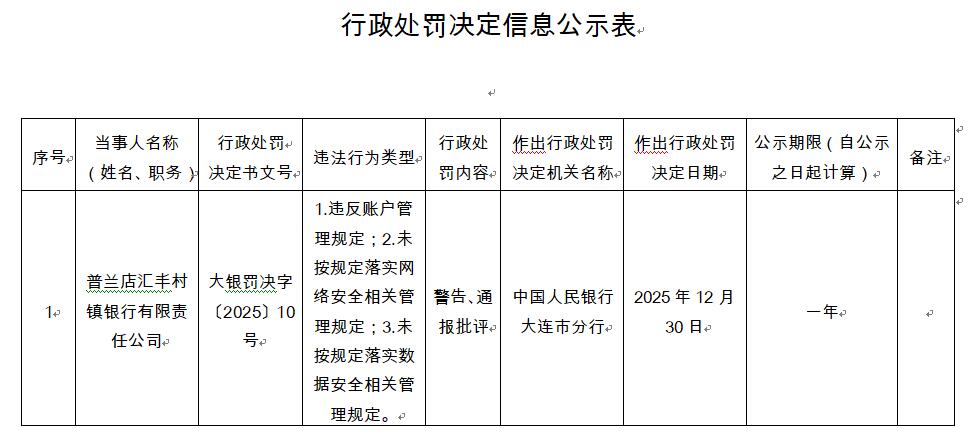 | 序号。 | 当事人名称 | 行政处罚。 | 违法行为类型+ | 行政处 | 作出行政处罚 | 作出行政处罚 | 公示期限(自公示 | 备注 | | --- | --- | --- | --- | --- | --- | --- | --- | --- | | | (姓名、职务) | 决定书文号。 | 1.违反账户管 | 罚内容。 | 决定机关名称。 | 决定日期。 | 之日起计算)。 | | | 10 | 普兰店汇手村 镇银行有限责 | 大银罚决字 (2025) 10 | 理规定:2.未 按规定落实网 络安全相关管 | 警告、通 | 中国人民银行 | 2025年12月 | 一年。 | ﺗﻬ | | | 任公司。 | 号 | 理规定:3.未 | 报批评e | 大连市分行。 | 30 日e | | | | | | | 按规定落实数 | | | | | | | | | | 据安全相关管 | | | | | | | | | | 理规定。( | | | | | | 中国经济网北京1月6日讯 中国人民银行大连市分行近日发布的行政处罚决定信息公示表(大银罚决字〔2025〕10号)显示,普兰店汇丰村 镇银行有限责任公司存 ...