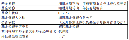中国经济网北京1月21日讯 今日,湘财基金公告,丁洋离任湘财周期轮动一年持有期混合。 | 基金名称 | 湘财周期轮动一年持有期混合型证券投资基金 | | --- | --- | | 基金简称 | 湘财周期轮动一年持有期混合 | | 基金主代码 | 013623 | | 基金管理人名称 | 湘财基金管理有限公司 | | 公告依据 | 《公开募集证券投资基金信息披露管理办法》 | | 基金经理变更类型 | 解聘基金经理 | | 共同管理本基金的其他基金经理姓名 | 包住敏 | | 离任基金经理姓名 | 丁洋 | (责任编辑:康博) 丁洋曾任长信基金管理有限责任公司助理研究员、研究员,湘财基金管理有限公司高级研究员、基 金经理助理。2023年12月1日起担任基金经理。 湘财周期轮动一年持有混合成立于2021年11月04日,截至2026年01月20日,其今年来收益率为 3.42%,成立来收益率为-6.43%,累计净值为0.9357元。 ...