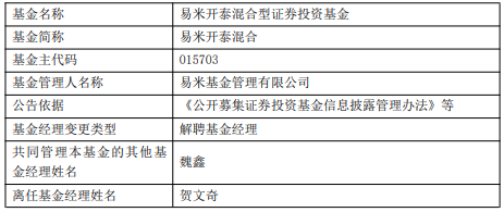 贺文奇离任易米开泰混合基金