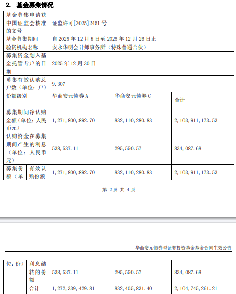 Core Viewpoint - The announcement details the effective contract of the Huaxia CSI 300 Index Quantitative Enhanced Securities Investment Fund, highlighting its fundraising success and management details [1][2]. Fund Details - Fund Name: Huaxia CSI 300 Index Quantitative Enhanced Securities Investment Fund [2] - Fund Code: 025480 [2] - Fund Type: Contractual open-end fund [2] - Effective Date of Fund Contract: December 30, 2025 [2] - Fund Manager: Huaxia Fund Management Co., Ltd. [2] - Fund Custodian: China Construction Bank Co., Ltd. [2] Fundraising Information - Total Net Subscription Amount during Fundraising: 1,342,513,165.00 RMB [1][3] - Interest Earned during Fundraising Period: 453,054.39 RMB [1][3] - Total Fund Shares: 1,342,966,219.39 shares [1][3] - Number of Valid Subscription Accounts: 22,251 [3] Management Team - Proposed Fund Manager: Jing Boling, who joined Huaxia Fund Management in July 2016 and has held various positions including researcher and assistant fund manager [1].