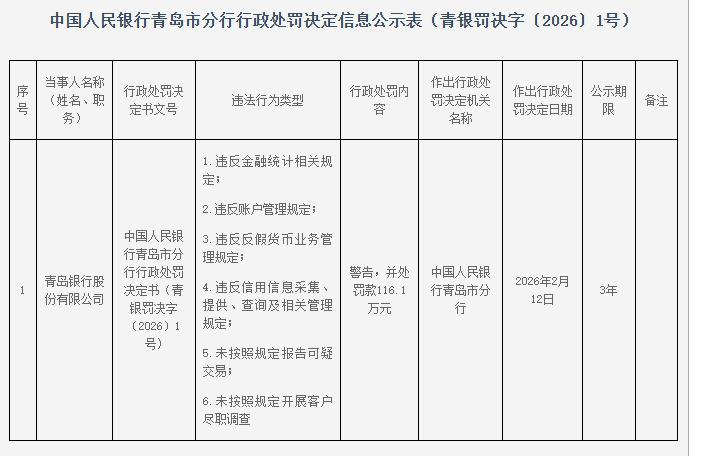 中国经济网北京2月17日讯 中国人民银行青岛市分行网站近日公布的行政处罚决定信息公示表(青 银罚决字〔2026〕1号)显示,青岛银行股份有限公司存在以下违法行为类型:1.违反金融统计相关规 定;2.违反账户管理规定;3.违反反假货币业务管理规定;4.违反信用信息采集、提供、查询及相关管 理规定;5.未按照规定报告可疑交易;6.未按照规定开展客户尽职调查。 | 店号 | 当事人名称 | 行政处罚决 | | 行政处罚内 | 作出行政处 | 作出行政处 | 公示期 | 备注 | | --- | --- | --- | --- | --- | --- | --- | --- | --- | | | (姓名、职 务) | 定书文号 | 违法行为类型 1. 违反金融统计相关规 | kin | 罚决定机关 名称 | 罚決定日期 | Re | | | | | | 定; 2. 违反账户管理规定; | | | | | | | | | 中国人民银 | 3. 违反反假货币业务管 | | | | | | | | | 行青岛市分 | 理规定; | | | | | | | 1 | 青岛银行股 | 行行政处罚 | 4. 违反信用信息采集、 ...